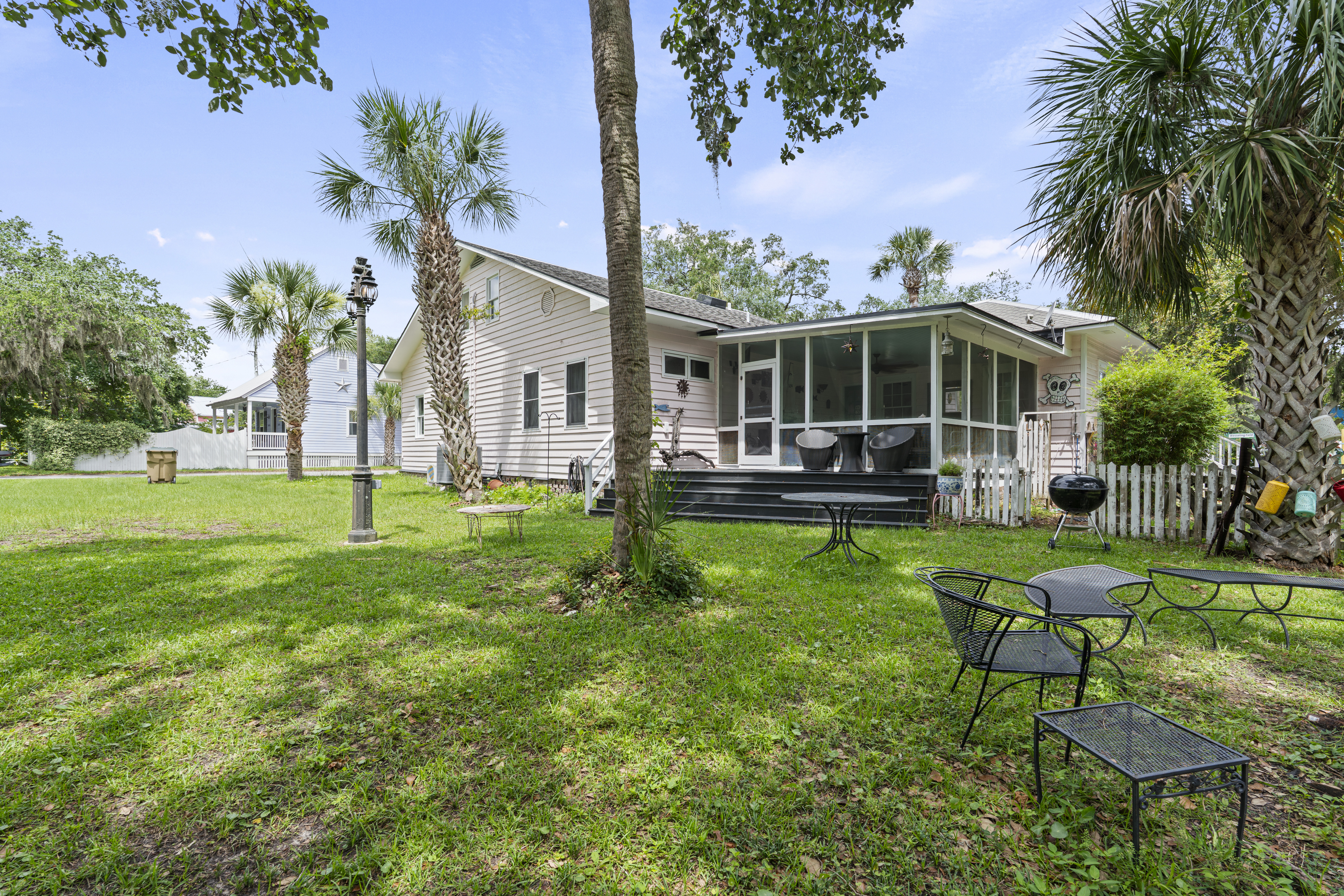 Step outside to the screened-in porch, an inviting space with an outdoor sectional sofa and an array of games and toys for kids. There's also an outdoor shower and a spacious backyard for children to play. The home includes a grill for outdoor cooking and entertainment. The yard is bordered by a public park with walking paths, a picnic area with a grill, a playground, a baseball diamond, and basketball and shuffleboard courts.
