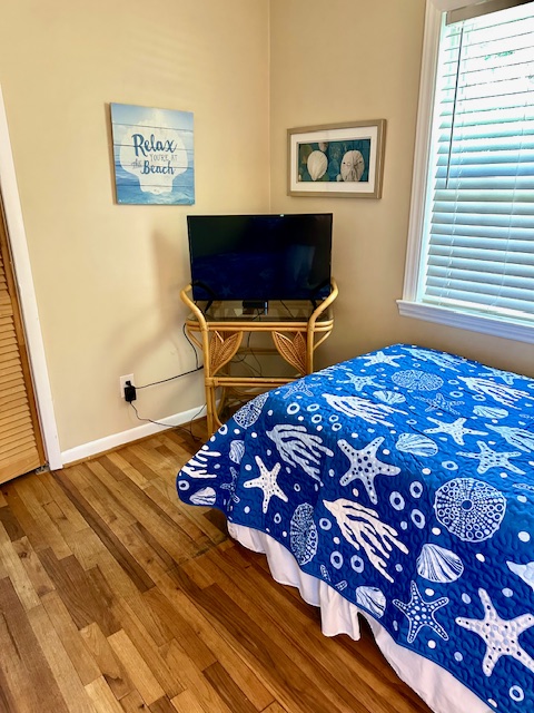 Second Bedroom: Two twin beds, flatscreen TV, dresser, and small closet—ideal for kids!